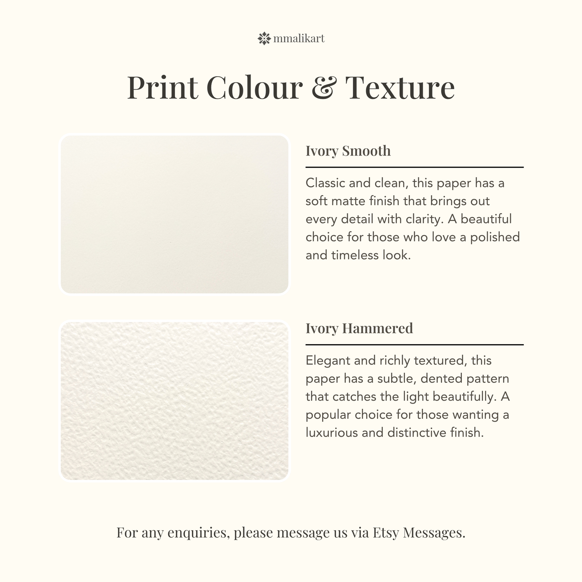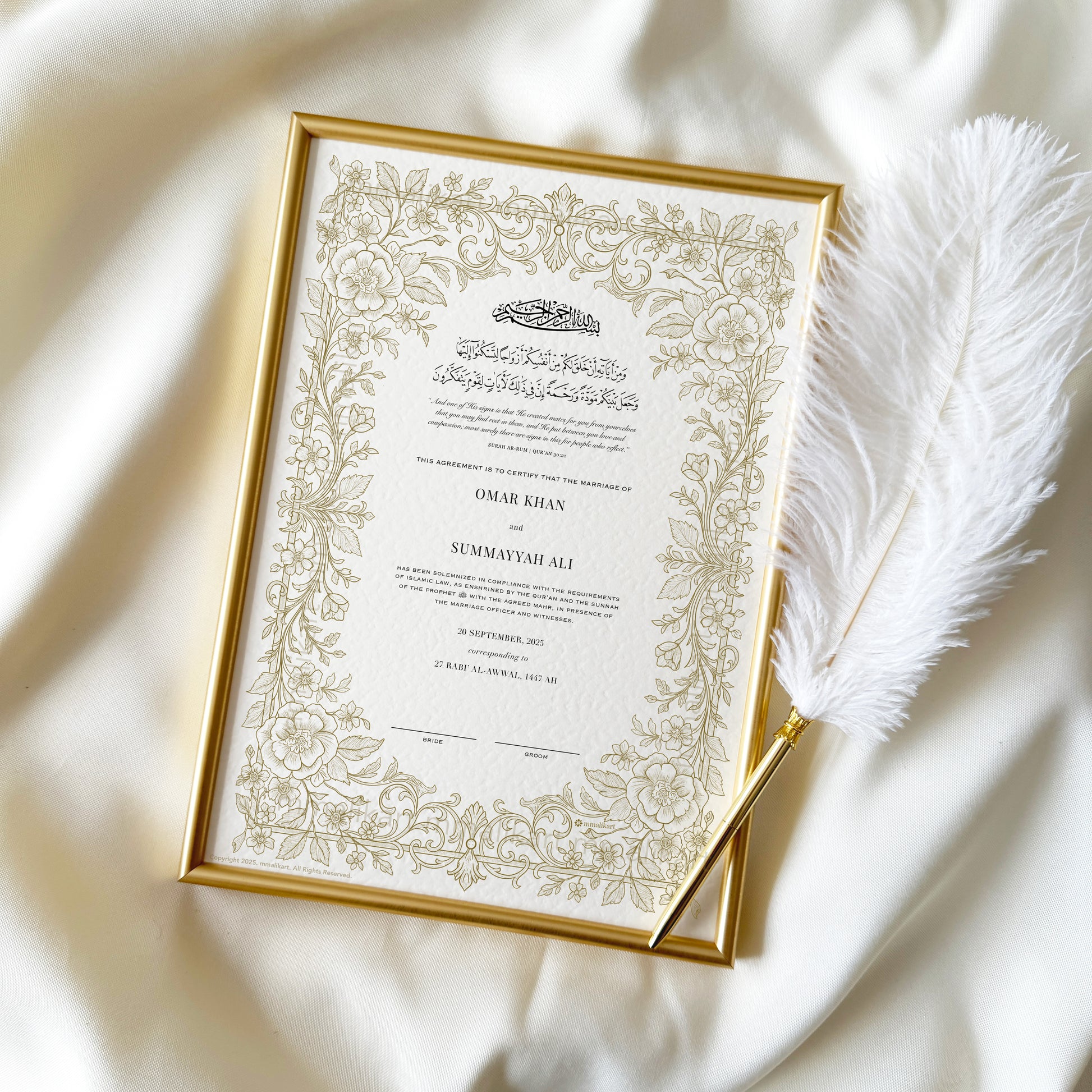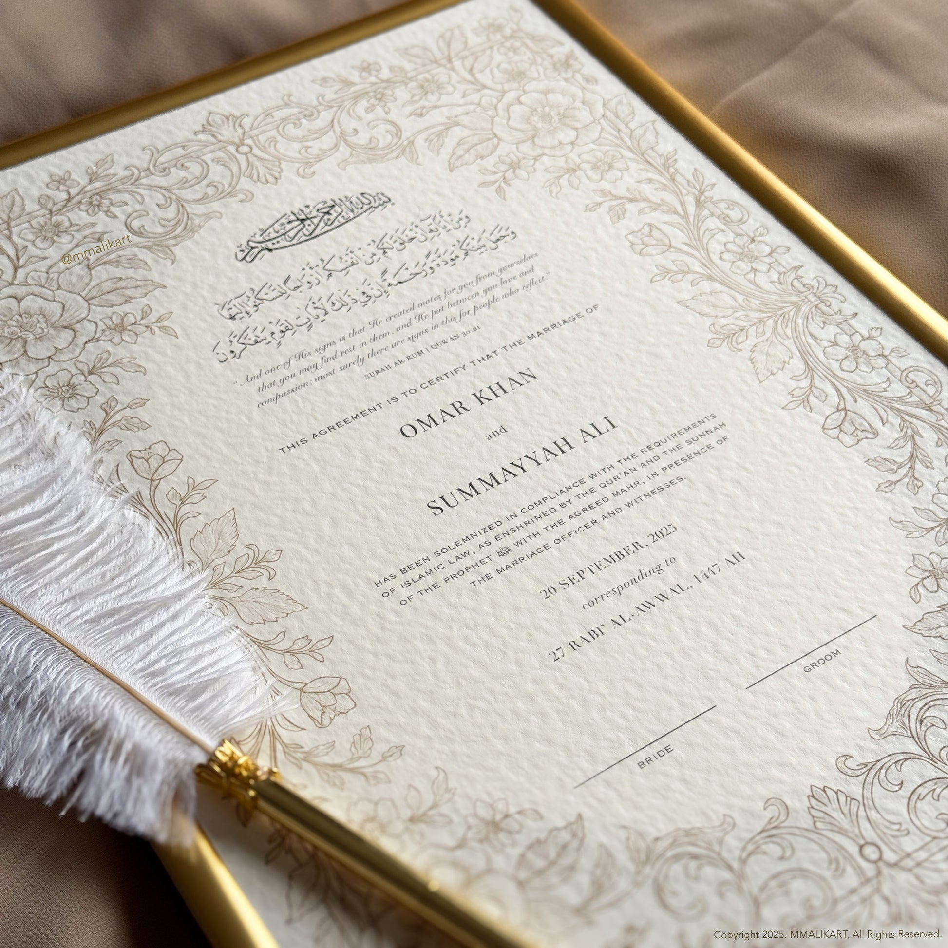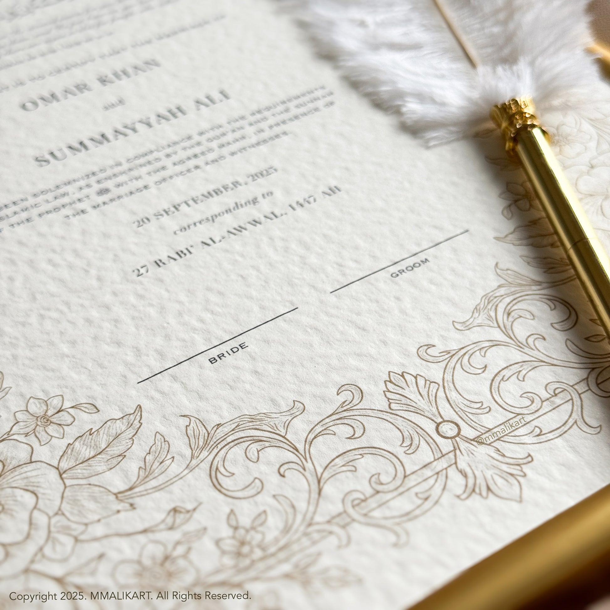 Our Nikkah certificates have been hand designed and carefully printed, giving them a luxurious appearance. The certificate is printed on smooth or hammered acid-free, heavy-weight ivory card (300gsm thickness).