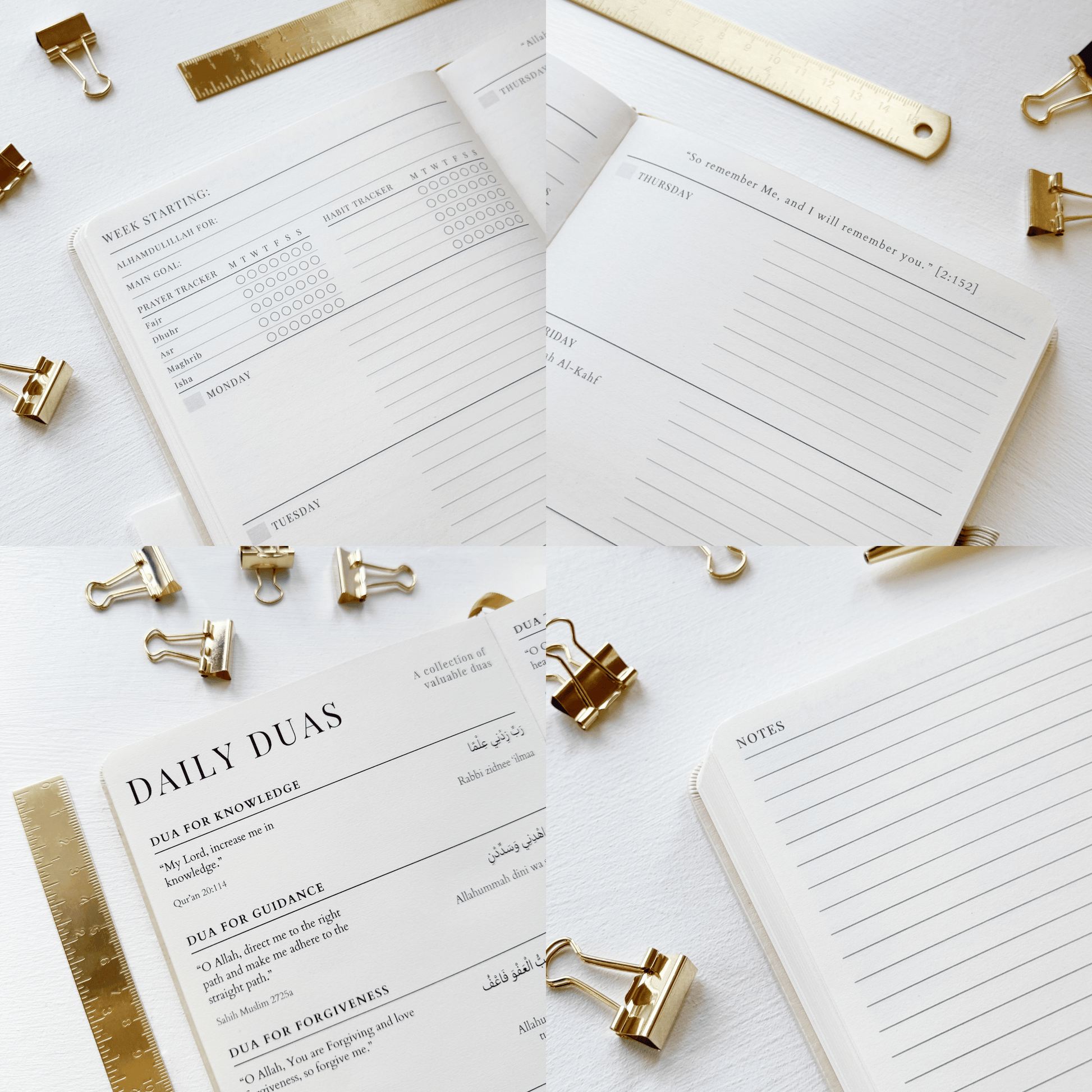 Our bestselling 12-month Deen Planner, now available at a special clearance price. These planners are fully functional and include all the guided pages, trackers, and tools you love — but may have small cosmetic imperfections such as minor dents, scratches, or packaging marks.